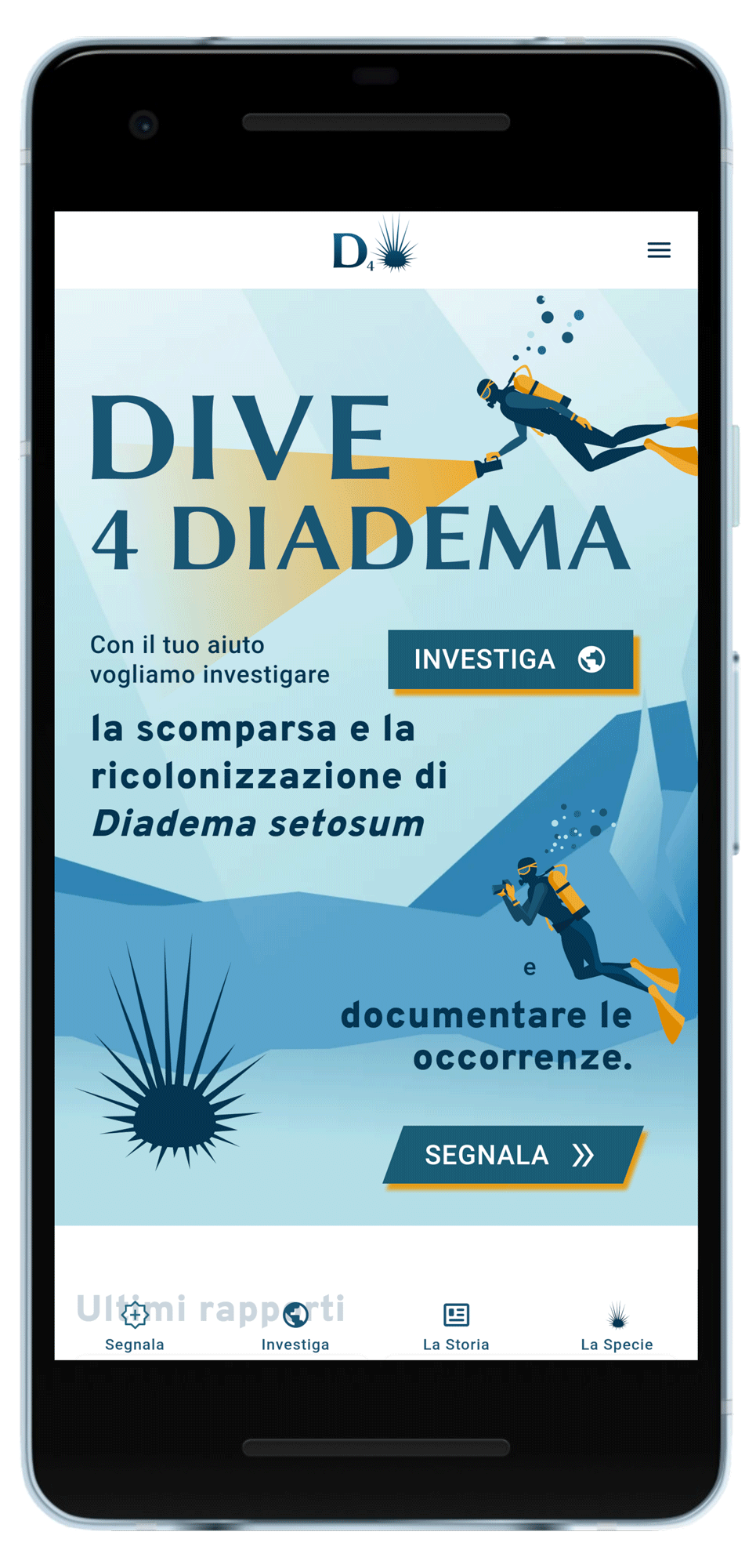 Invitiamo tutti i subacquei ricreativi a riportare le osservazioni fatte durante le proprie immersioni. È disponibile una app gratuita e multilingue per smartphone e tablet, Android e iOS. Ogni segnalazione sulla presenza di ricci di mare, morti o in vita, ci aiuta a conoscere meglio lo stato della morìa in corso. Anche non aver avvistato ricci è un’importante informazione da segnalare. Dive4Diadema è uno sforzo congiunto messo in campo da subacquei ricreativi, centri di immersione, operatori turistici e organizzazioni didattiche. Solo insieme possiamo salvare gli ultimi esemplari di riccio diadema dai lunghi aculei neri.